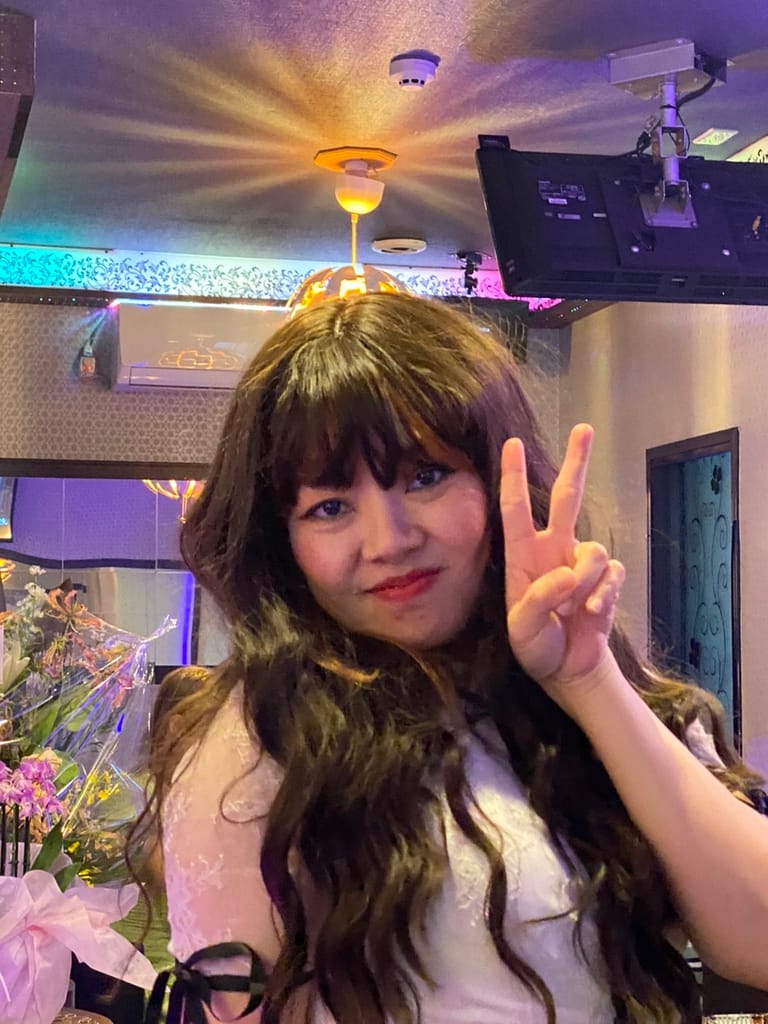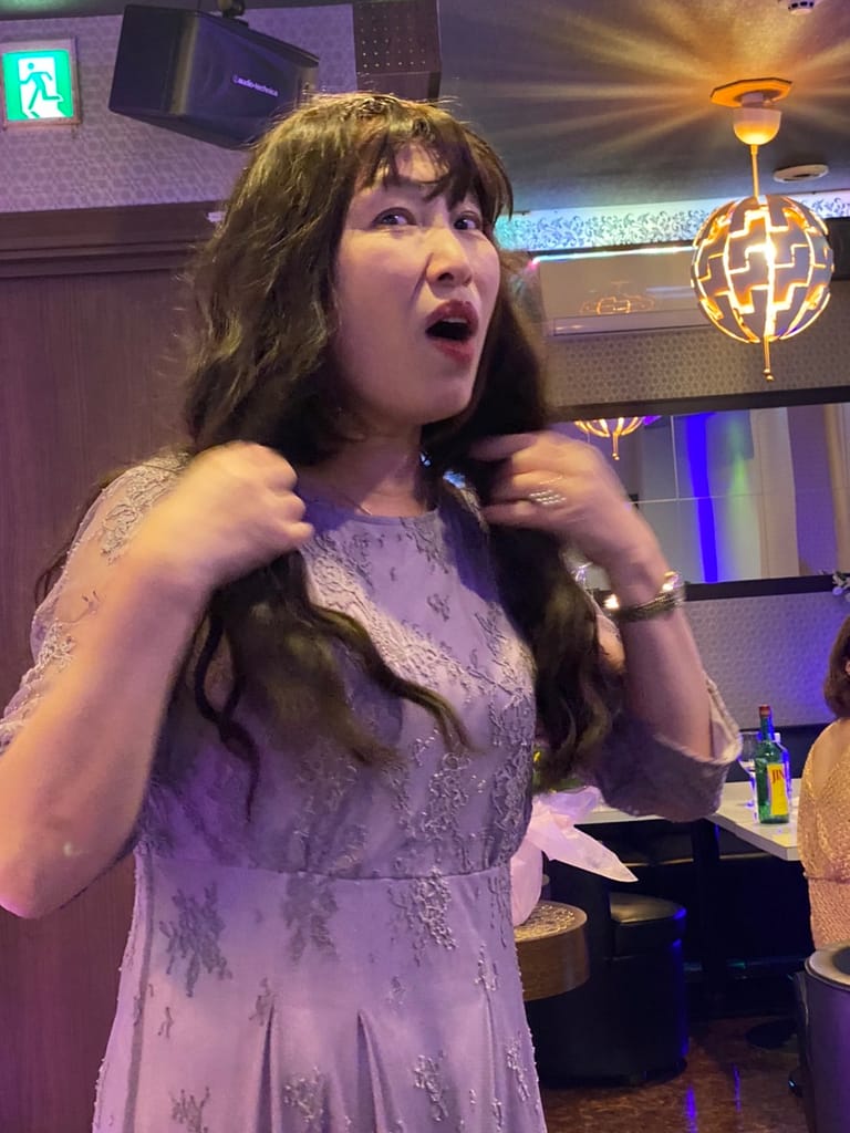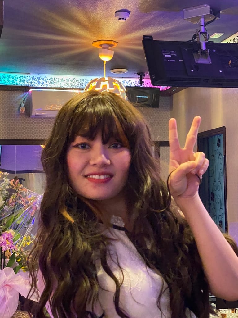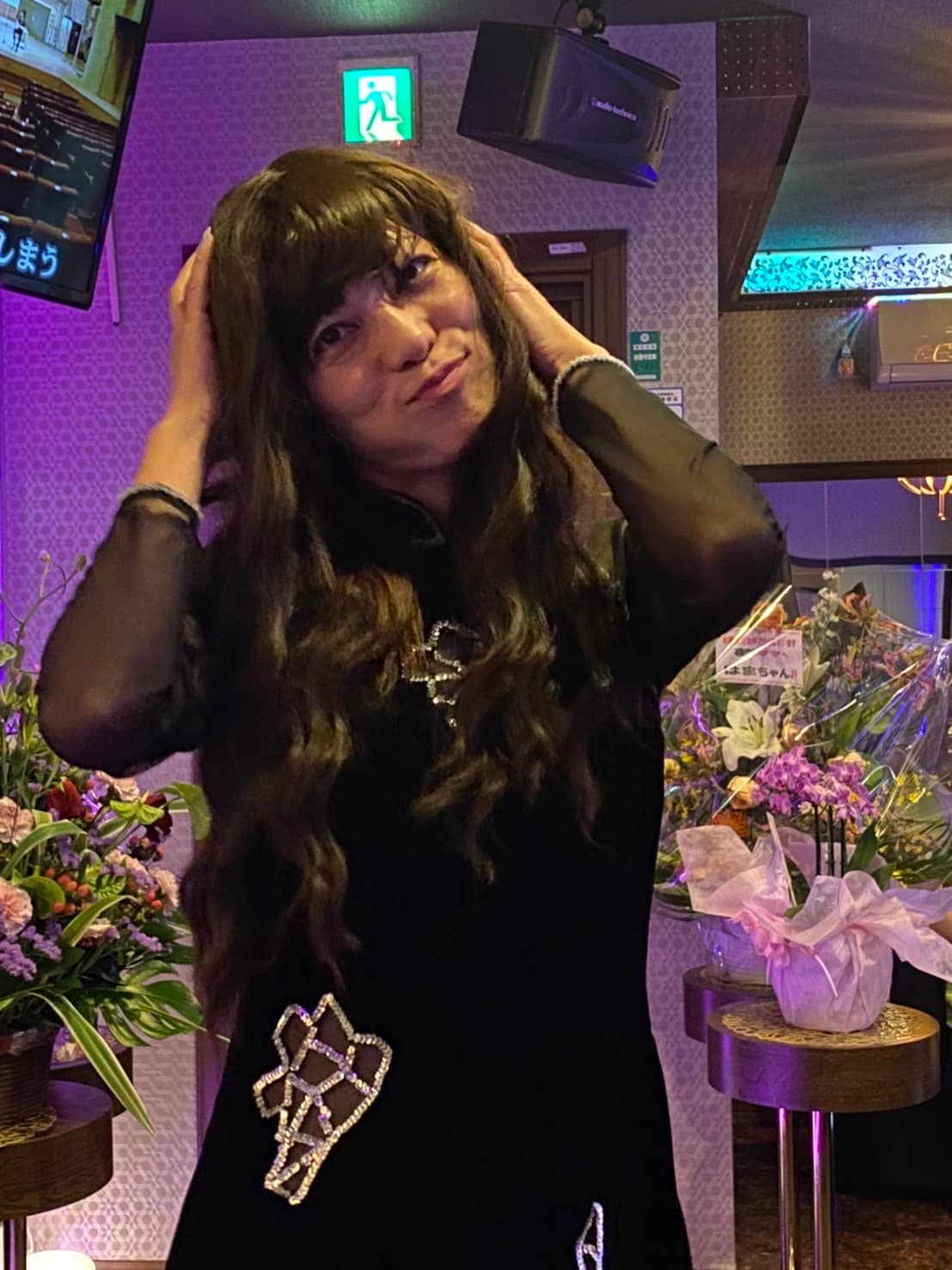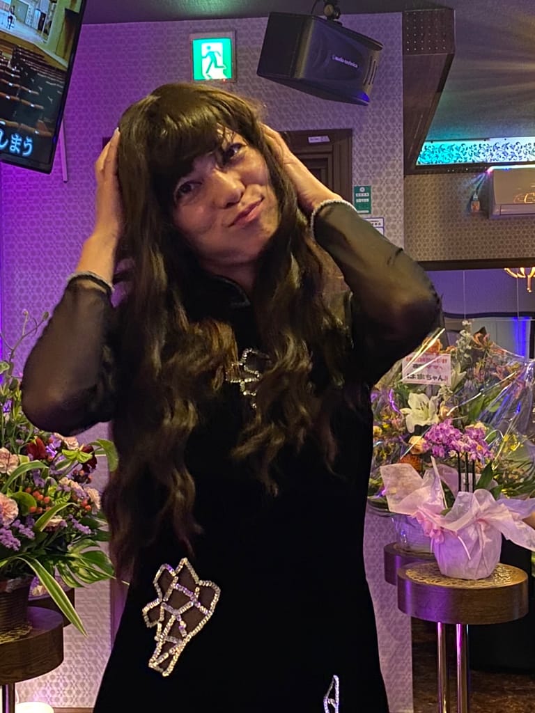 ウイッグをかぶりカメラを向けられたら、自然とカメラ目線でニッコリ。次は私がかぶる、次は私、開店そうそう、楽しい気持ちでハイポーズ。