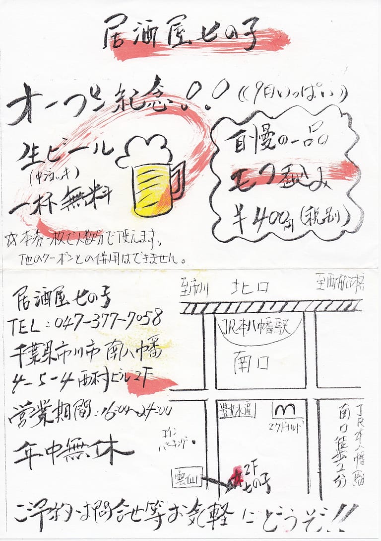 本八幡ラーメン雲仙の2階、新装開店した居酒屋七の子です。