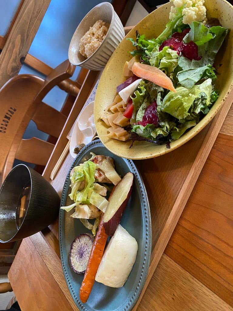 気になっていたお店は、有機野菜がいっぱいの料理。にんじんジュースと一緒にいただきました