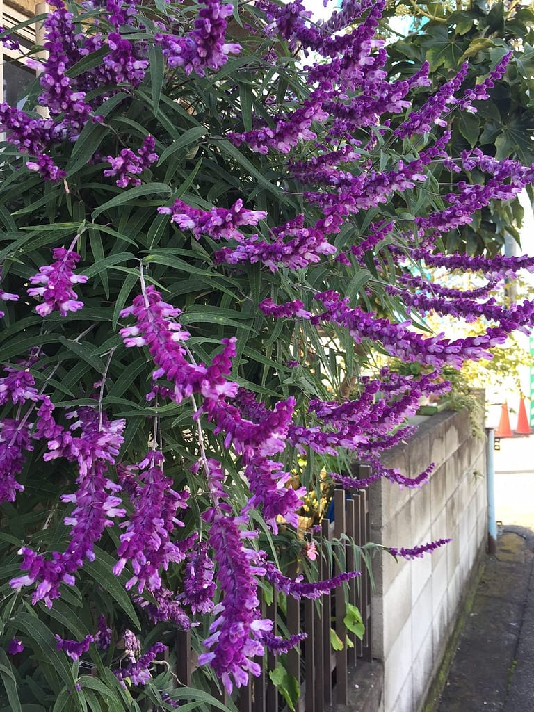 お花の名前はわかりませんが、紫に染まったお花はまるで藤の花のようです。お家の方は大切に育てているんでしょうね。